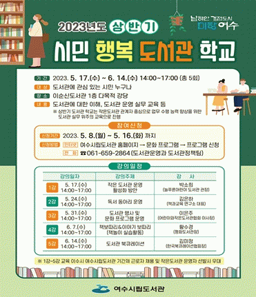 교육 참여를 희망하는 시민은 오는 16일까지 여수시립도서관 홈페이지 또는 전화로 신청하면 된다.