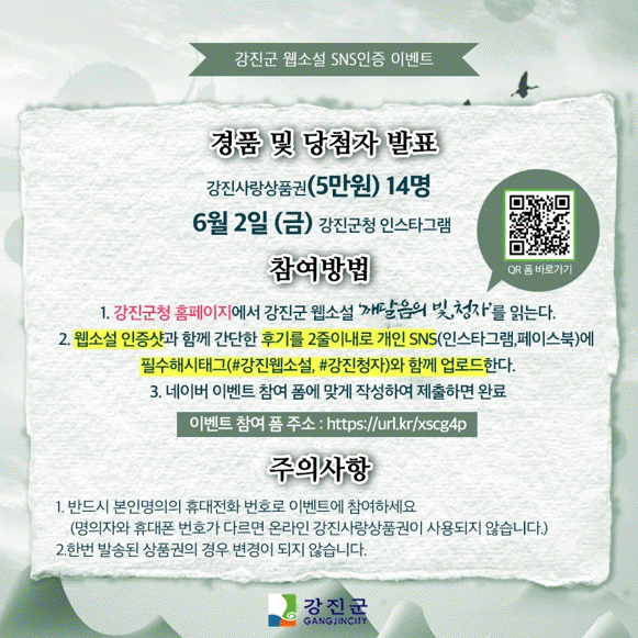 5월 이벤트는 5월 8일을 시작으로 5월 28일까지 21일간 진행되며, 웹소설을 구독하고 인증샷과 함께 간단한 후기 및 필수 해시태그(#강진웹소설, #강진청자)를 업로드 하면 추첨을 통해 강진사랑상품권(5만 원)을 14명에게 제공한다.