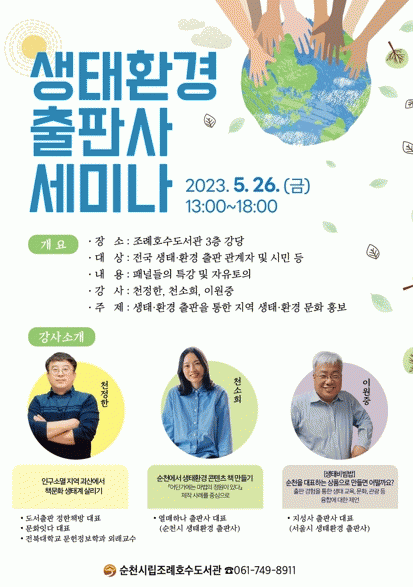 특강은 ▲천정한(도서출판 정한책방 대표) ‘인구소멸 지역 괴산에서 책문화 생태계 살리기’ ▲천소희(열매하나 출판사 대표) ‘순천에서 생태환경 콘텐츠 책 만들기 - '어딘가에는 마법의 정원이 있다' 제작사례를 중심으로’ ▲이원중(지성사 출판사 대표) ‘[생태비빔밥], 순천을 대표하는 상품으로 만들면 어떨까요? - 출판 경험을 통한 생태 교육, 문화, 관광 등 융합에 대한 제언’으로 진행된다.