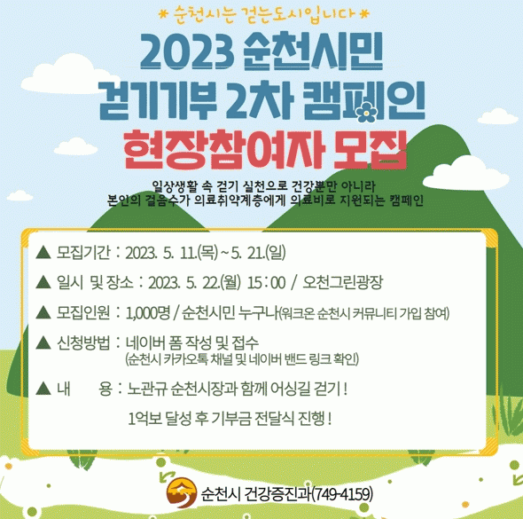 현장 참여를 원하는 시민은 오는 21일까지 네이버폼으로 신청하면 되고 1,000명을 선착순으로 접수한다. 참여 시민에게는 걷기앱 워크온(순천시 공식 커뮤니티)에서 걷기 기부증이 발급된다.