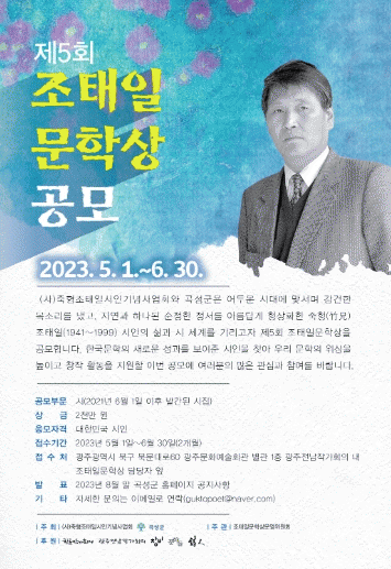 접수는 광주광역시 북구 북문대로 60 광주문화예술회관 별관 1층 광주전남작가회의 내 제5회 조태일문학상 담당자 앞으로 응모하면 된다.