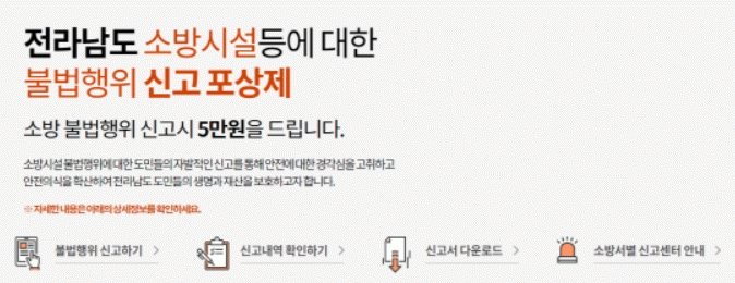 목포소방서는 안전무시 관행 근절을 위해 연중 업무로 신고포상제도를 운영 중에 있으며, 목포소방서 홈페이지 민원마당에서도 해당 내용을 확인 후 신고할 수 있다.