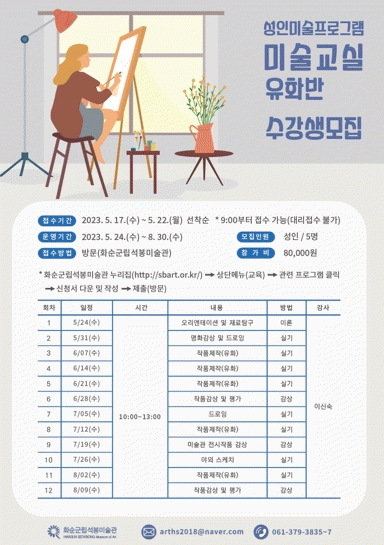 교육은 화순군립석봉미술관 교육창작실에서 진행되고 모집인원은 5명이며 수강료는 8만 원이다.