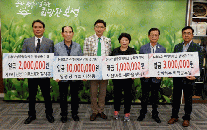 16일 보성군은 일광당, 퇴직공무원회, 제39대 보성산양라이온스, 보성읍 노산마을부녀회에서 보성군장학재단에 각각 1천만 원, 3백만 원, 2백만 원, 1백만 원을 기탁했다고 밝혔다.