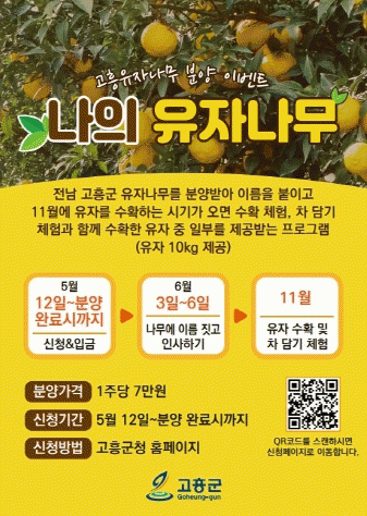 ‘나의 유자나무’ 이벤트는 11월에 개최되는‘고흥 유자석류 축제’와 연계해 ‘가을엔 고흥 유자여행’을 테마로 도시민들에게 고흥에서만 경험할 수 있는 특별한 추억을 제공함으로써 지역 관광에 활력을 더할 계획이다.