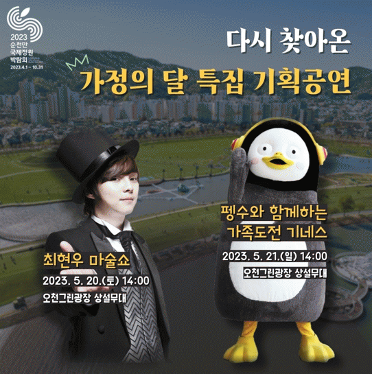 21일에는 어린아이, 성인남녀 모두에게 사랑받는 인기 캐릭터 ‘펭수’가 처음으로 순천을 찾는다. 이날 행사는 박람회 홍보대사인 장송호의 축하공연으로 시작되며, 이어서 펭수가 직접 마이크를 잡고 즉석에서 참가할 가족들을 선발해 도전 훌라후프, 도전 림보 등 레크리에이션을 진행한다.