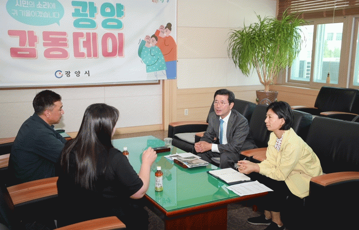 한편, ‘광양 감동데이’는 시민 누구나 시장(부시장, 국장)을 만나 시정에 대한 의견들을 자유롭게 이야기함으로써 시민의 고충해소는 물론 시의 발전 방향을 모색하는 자리로 매월 한차례 광양시청 2층 시민접견실에서 열리고 있다.