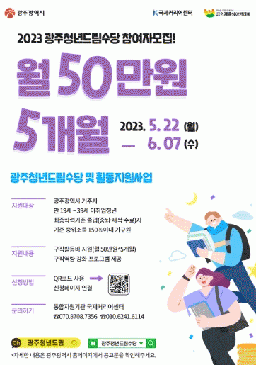 신청은 광주청년드림수당 공식사이트에서 온라인으로 하면 된다. 광주시는 지원 신청자의 가구 소득, 미취업기간, 구직활동계획서를 심사해 최종 선발할 계획이다.