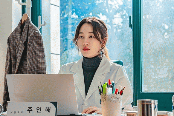 흰 가운을 입은 채 학교 기간제 보건교사로 완벽 변신한 그녀의 모습 또한 눈길을 끈다. 원지안은 책상 앞에서 골몰히 생각에 잠긴 듯하고 형형하게 살아있는 그녀의 눈빛이 묘한 긴장감을 감돌게 한다.
