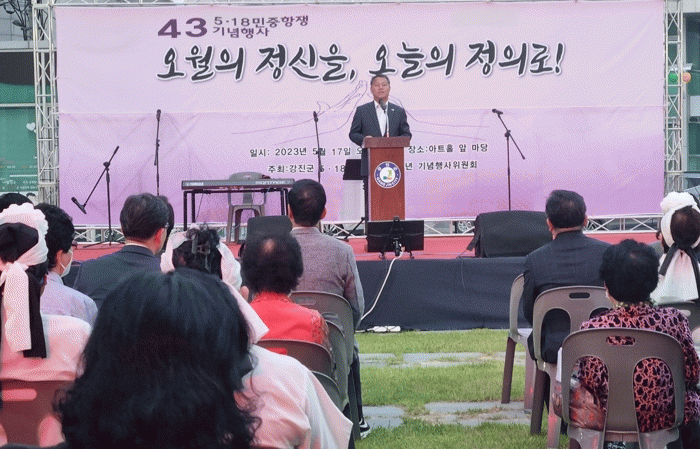 서순철 강진부군수는 추념사를 통해 “5.18은 군부독재에 맞서 시민 스스로의 힘으로 민주주의와 인권, 평화와 정의를 지켜낸 자랑스러운 승리의 역사이다”면서 “대한민국을 넘어, 전 세계 곳곳에서 자유를 갈망하는 국민들에게 희망의 길이 되고 있다”고 말했다.
