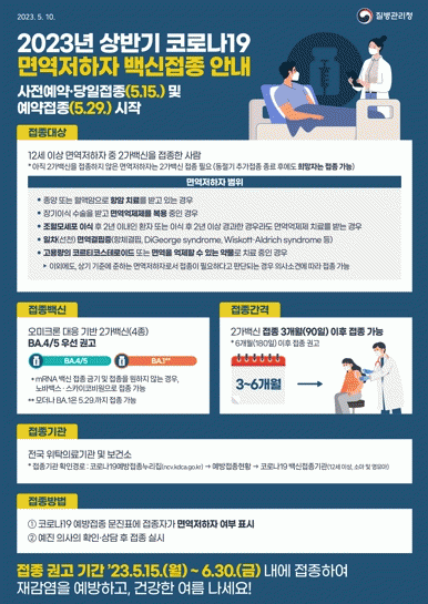질병관리청의 ‘2023년 상반기 코로나19 고위험군 접종계획’에 따라 면역저하자 등 고위험군에 대한 사전예약 및 당일 접종을 진행중이다.