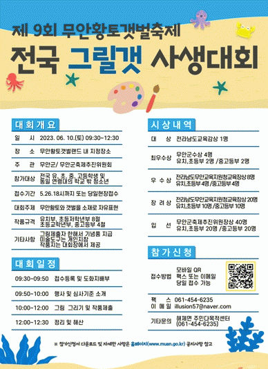무안군 관계자는 “무안이 자랑하는 드넓은 황토와 무안갯벌을 조망할 수 있고, 다양한 체험 프로그램도 즐길 수 있는 제9회 무안황토갯벌축제와 사생대회에 관심 있는 청소년들이 적극 참여해주길 기대한다”고 말했다.