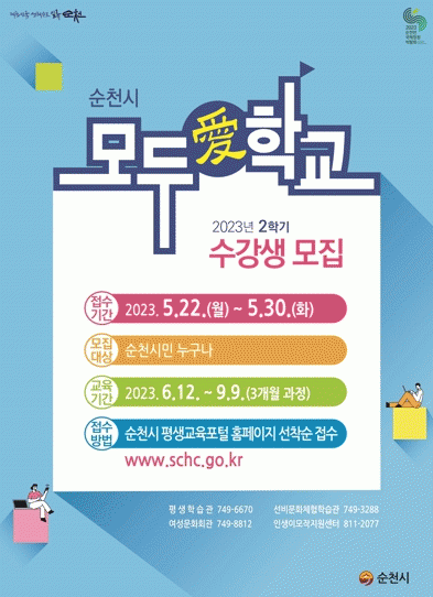 수강 신청은 순천시평생교육포털 누리집에서 선착순으로 접수하며 순천시민이면 누구나 가능하다. 기타 자세한 사항은 순천시 평생교육과에 문의하면 된다.