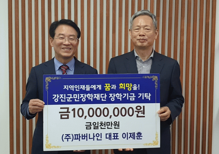 강진군은 지난 17일, 파버나인이 지역 인재 육성에 써달라며 장학금을 기탁했다고 19일 밝혔다.