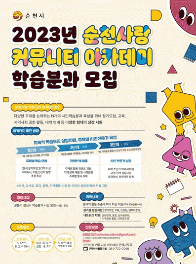 한편, 순천사랑 커뮤니티 아카데미는 기존의 일회성 강의 방식이 아닌 다양한 계층을 대상으로 지속적인 학습기회를 제공하고 활동을 지원하는 커뮤니티형 학습 지원 사업이다.