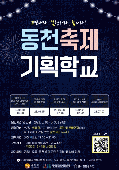 순천시 관계자는 “2023 역세권 동천축제기획학교는 순천 역세권의 신규 문화 기획 인력을 배출하고 지역 축제 인프라를 구축할 수 있는 중요한 사업으로 시민들의 관심과 참여가 필요하다”라며, “동천을 활용한 축제 기획 활동을 통해 지속가능한 순천 특화 축제가 발굴되길 희망한다”고 말했다.