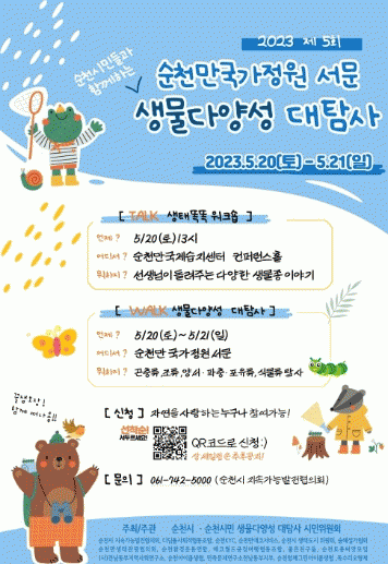 5월 22일 ‘생물다양성의 날’을 기념해 순천만국가정원 서문 일원에서 진행되는 이번 행사는 올해 5회 차를 맞는다. 사전에 구성된 순천시민 생물다양성 대탐사 시민위원회가 주관하며 생태똑똑 워크숍을 비롯하여 생물다양성 대탐사, 전시, 홍보부스 등 다양한 프로그램으로 구성된다.