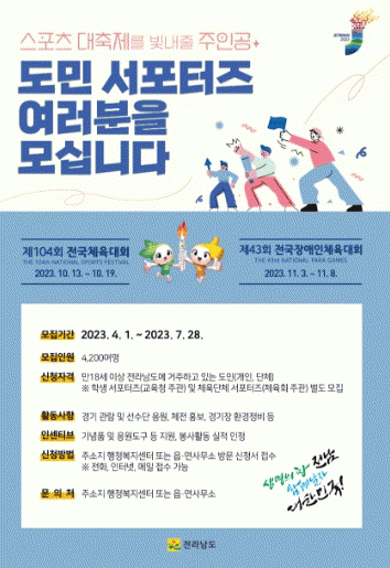 선발된 군민 서포터즈는 오는 10월부터 11월까지 전국체전과 전국장애인체전이 끝나는 2개월간 화순군에서 활동하게 된다.