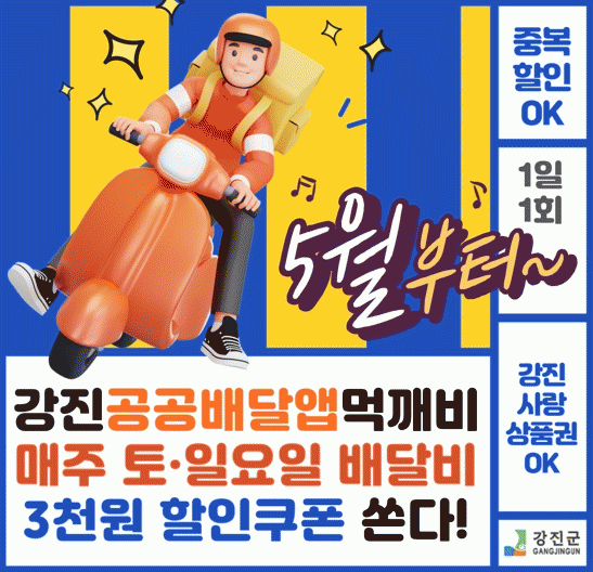 강진군은 5월부터 연말까지 매주 주말 공공배달앱 ‘먹깨비’로 주문 시 배달비 할인쿠폰을 지급하는 이벤트를 통해, 먹깨비에서 매주 토요일과 일요일 1만 5,000원 이상 주문 시, 배달비 3천 원 할인쿠폰이 제공한다.