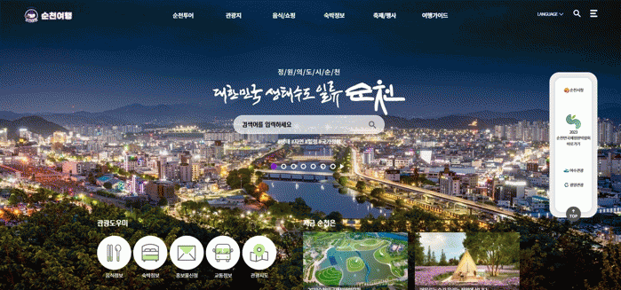 순천 관광 누리집은 음식, 교통, 숙박 정보 등 방문객들이 자주 이용하는 서비스를 메인 화면에 배치하여 관광 정보에 쉽게 접근할 수 있도록 했다.