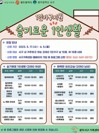 서구 관내 거주하고 있는 20대에서 50대 사이 1인가구는 서구가족센터 홈페이지를 통해 누구나 신청가능하다.