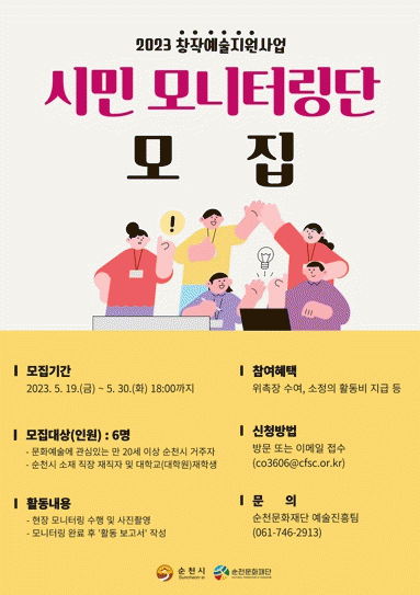 순천문화재단 관계자는 “모니터링단 운영으로 창작예술지원사업에 대한 시민들의 다양한 의견을 수렴하고 사업에 대한 관심을 제고할 예정”이라며, “문화예술 모니터링 활동에 관심 있는 시민 여러분의 많은 참여 바란다”고 밝혔다.
