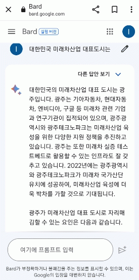 바드는 “광주시는 인공지능(AI) 산업에 대한 투자를 장려하는 정책을 채택하고, 인공지능(AI) 산업을 육성하기 위한 기반시설을 구축했다”며 “그 결과, 광주는 현재 인공지능(AI) 기업 100여개, 인공지능(AI) 관련 인력 1만여명이 활동하는 인공지능(AI) 중심도시로 성장했다”고 답했다.