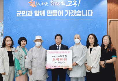이번 성금은 정각사 주지 정암 스님과 신도들이 가정의 달을 맞아 십시일반 마음을 모은 것으로 고흥군은 5백만원의 성금을 기탁받았다.