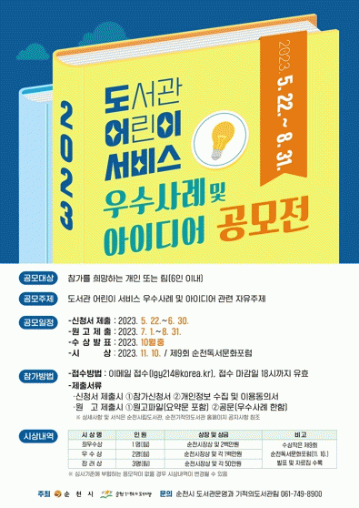 공모에 대한 상세 사항 및 참가 양식은 순천시립도서관 및 순천기적의도서관 누리집 공지사항에서 확인할 수 있다. 기타 자세한 사항은 순천기적의도서관로 문의하면 된다.