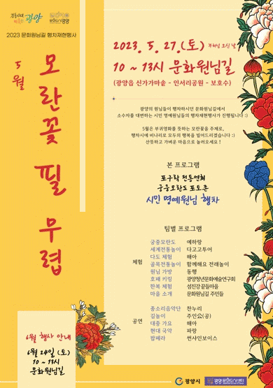 이번 회차는 ‘모란꽃 필 무렵’이라는 부제로 진행되며, 오는 27일 토요일 오전 10시부터 오후 1시까지 광양읍 인서리 154번지(보호수 앞 주차장) 일원에서 개최된다.