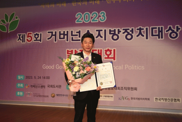 우수 지방정치 사례를 발굴·확산시키기 위해 개최된 ‘거버넌스 정치대상’ 공모는 거버넌스센터가 주최하고 대통령직속 국가균형발전위원회, 한국지방신문협회 등이 후원하는 상으로, 거버넌스 구현 · 성취도 · 혁신 파급성 · 창의성 · 참신성 · 자기계발 등을 평가해 수상자를 결정했다.