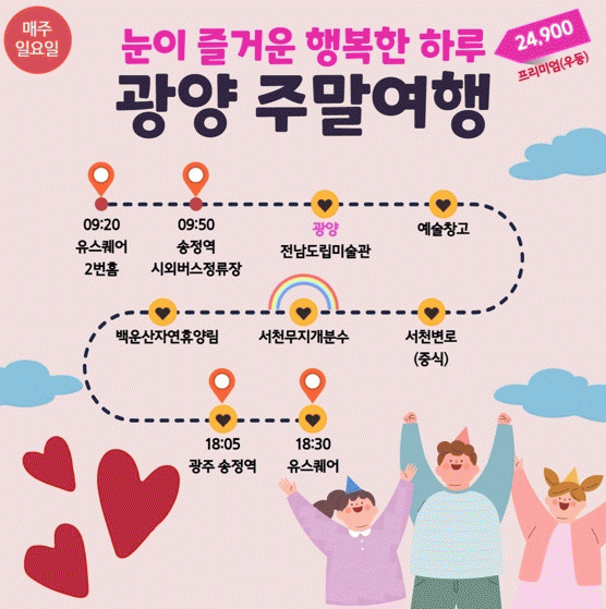 이어 광양불고기특화거리에서 점심을 즐긴 후, 서천무지개분수, 백운산자연휴양림 등을 투어하고 송정역(18시 5분), 유스퀘어(18시 30분)에 도착하는 낭만코스다.