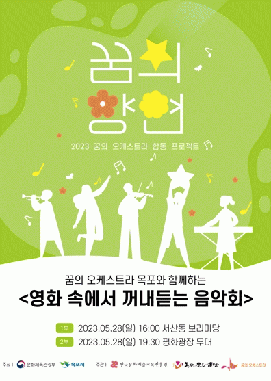 꿈의 오케스트라 목포가 펼칠 ‘영화 속에서 꺼내 듣는 음악회’ 공연은 서산동 보리마당에서 오후 4시에 1부가 진행되며 2부는 평화광장 무대에서 오후 7시 30분에 진행된다.