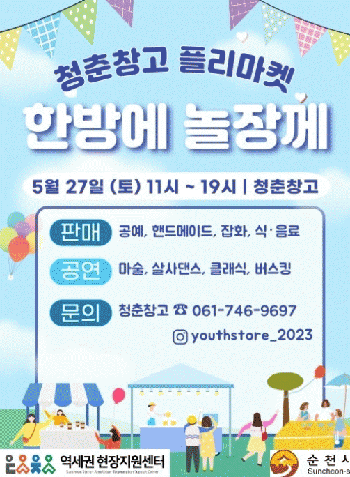 순천시 관계자는 “이번 플리마켓은 청춘창고의 활성화를 위해 주민이 직접 기획하고 순천시 도시재생 역세권 현장지원센터가 지원하는 행사”라며, “많은 관심과 참여, 응원을 부탁드린다”고 말했다.