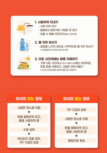 온열질환은 열로 인해 발생하는 열사병과 열탈진 등 급성질환으로 뜨거운 환경에 장시간 노출 시 두통, 어지러움, 근육경련, 피로감, 의식저하 등의 증상을 보인다. 방치하면 생명이 위태로울 수 있다. 온열질환 환자가 발생하면 즉시 119에 신고하고 환자를 시원한 장소에 옮겨 몸을 식혀야 한다.