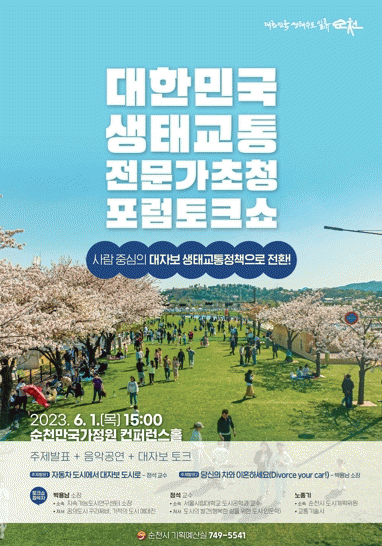이번 행사는 대한민국 생태교통 전문가를 초청해, ‘사람 중심의 대자보 생태교통정책으로 전환!’을 주제로 한 포럼과 시민 공감대 형성을 위한 토크쇼로 구성된다. 진행 순서 사이에는 순천 청년들로 구성된 퓨전 국악.성악 그룹의 공연도 예정되어 있다.