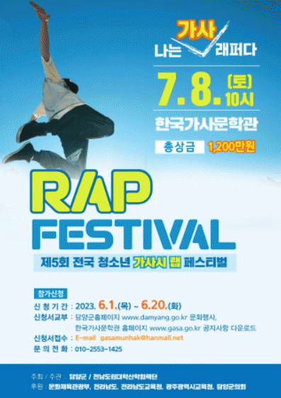 담양군은 오는 7월 8일 제5회 전국 청소년 가사시 랩 페스티벌을 개최한다고 30일 밝혔다.