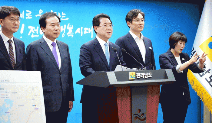 김영록 지사는 이날 오전 도청 브리핑룸에서 박홍률 목포시장, 우승희 영암군수, 김성훈 무안부군수가 함께 참석한 가운데 ‘전남 서남권 SOC 新 프로젝트’를 발표했다.