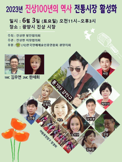 이번 행사는 진상면이장협의회 주관으로 100년 전통의 역사를 가진 진상5일시장의 재개장에 이어 지역민에게 사랑받는 시장으로 발돋움하기 위해 지역예술인 초청 공연과 고객 경품행사로 진행된다.