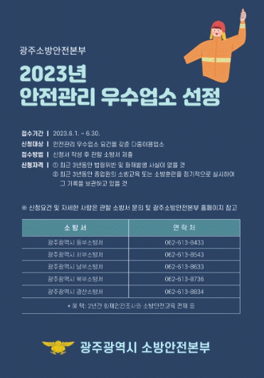 김종률 방호예방과장은 “시민이 안심하고 이용할 수 있도록 영업주의 자율적 안전관리 문화 정착을 기대한다”며 “안전관리 우수 요건을 갖춘 다중이용업소의 많은 신청을 바란다”고 말했다.