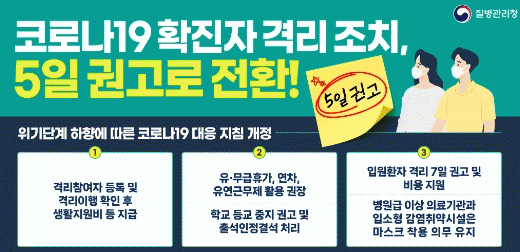 또 코로나19 확진자의 7일 격리 의무가 5일 권고로 전환됨에 따라 코로나19 확진자나 확진자와 접촉 후 의심 증상이 있는 사람은 마스크 착용 의무가 없더라도 착용할 것을 적극 권고할 방침이다.