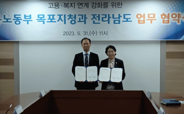 이날 협약식에는 이상심 전남도 보건복지국장, 한인권 고용노동부 목포지청장 등 관계자 10여 명이 참석해 저소득층 등 복지 수급자의 안정적 일자리 취업을 통한 탈수급 및 자립 지원에 적극 협력하기로 약속했다.