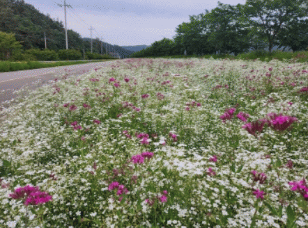 홍수조절지 관리사무소부터 종단지점까지 조성된 1.4km 길이의 꽃길은 하얗고 풍성한 안개꽃 사이에 진보라색 끈끈이대나물이 어우러져 방문객들의 눈길을 사로잡고 있다.