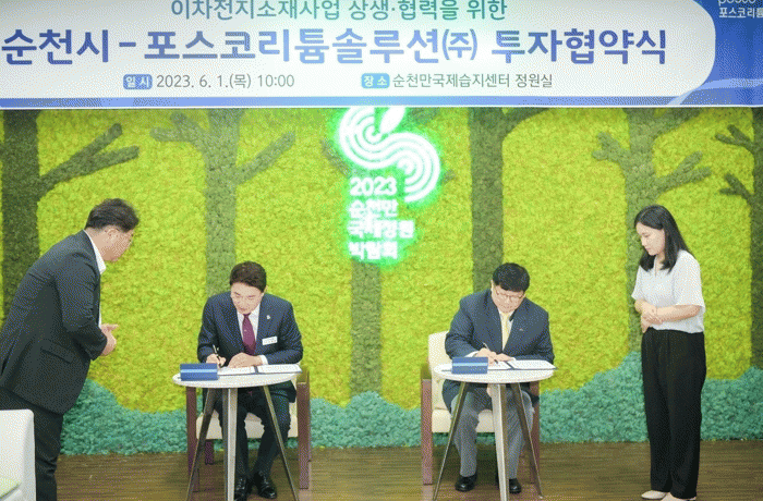 1일 5,700억 원 규모의 포스코리튬솔루션(주) 투자협약은 배터리 양극재 원료인 수산화리튬 생산체제를 구축하고 이차전지소재사업을 활성화하기 위한 것으로‘전남 이차전지 소재·부품 특화단지 지정’과 함께 순천이 미래 첨단소재산업의 경제 영토를 확장하겠다는 구상이다.