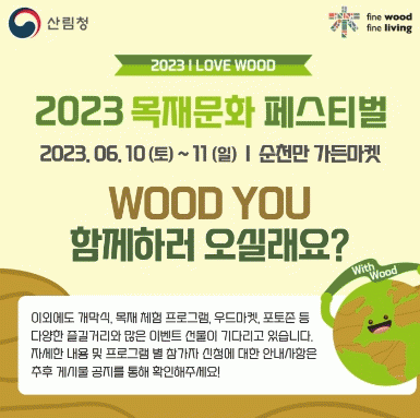 올해 11회째를 맞은 목재문화페스티벌(주관 산림청, 전라남도, 순천시)은 산림청이 추진하는‘l LOVE WOOD’캠페인의 일환으로,‘생활 속 목재이용 으로 탄소중립 실천하기’를 주제로 진행된다.