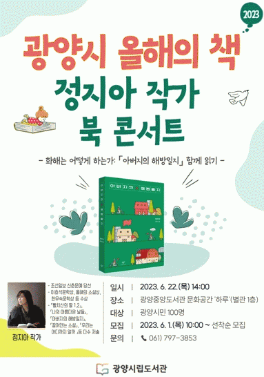 정지아 작가는 이번 행사에서 주제 도서인 '아버지의 해방일지' 집필 과정과 지역공동체(전남 지역)가 작품에 미친 영향에 대해 풀어놓을 예정이다. 진행은 2023년 용강도서관 상주작가로 활동하고 있는 박두규 아동문학가가 맡는다.