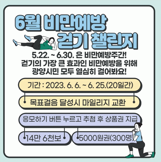 챌린지 기간 중 14만 6천 보를 걸으면 14만 6천 마일리지가 쌓이고, 모바일 문화상품권 5천원 쿠폰 교환이 가능하다. 매일 꾸준히 걷기 운동을 실천할 수 있도록 1일 최대 8천 보로 제한해 누구나 부담 없이 참여할 수 있다.