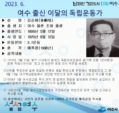 ‘김순배 선생’은 1919년 3월 10일 광주 시내에서 벌어진 독립만세운동에 참가해 군중 1천여명과 함께 독립선언서와 ‘경고 아 이천만 동포’라는 격문을 배포했다.