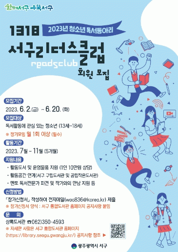 독서동아리는 7월부터 11월까지 월 1회 이상 정기모임 청소년 추천 도서‘한달한책’읽고 생각을 나누는 활동으로 진행되며, 서구는 동아리 활동을 위한 도서와 활동 공간을 제공하고 독서전문가 멘토 강사를 파견해 다양한 독후활동 프로그램을 지원할 예정이다.