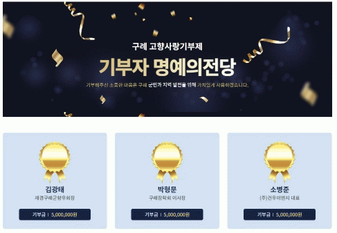 구례군 고향사랑기부제 온라인 명예의 전당은 개인의 기부 최대한도인 500만 원을 기탁한 기부자의 이름과 소속을 게시하는 형태로 운영되며, 군 홈페이지 내 고향사랑기부제 페이지를 통해 확인할 수 있다.